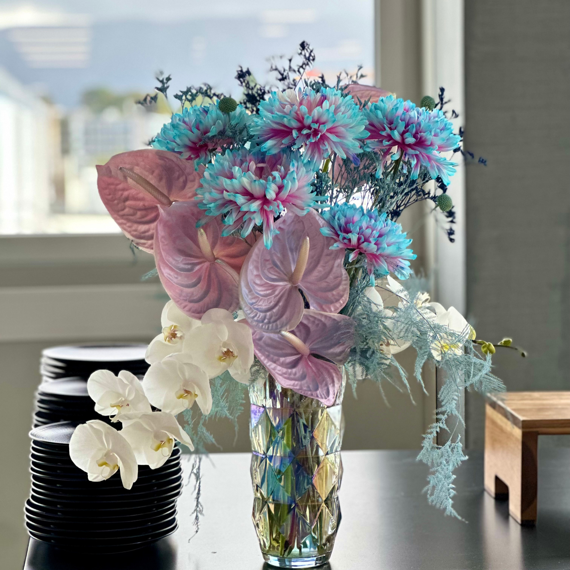 Pour donner vie à ce thème d’intelligence artificielle, nous avons transformé les végétaux avec des teintes audacieuses et des textures surprenantes. Les feuilles et fleurs, teintées de couleurs saturées et presque éthérées, conféraient aux compositions un aspect surréel, presque comme si elles provenaient d’un monde imaginaire. En utilisant des coloris métalliques et des finis brillants, nous avons joué sur des effets de contraste pour accentuer cette esthétique futuriste. Chaque arrangement a ainsi pu transmettre cette impression d'une nature repensée et transformée, tout en conservant son caractère captivant.