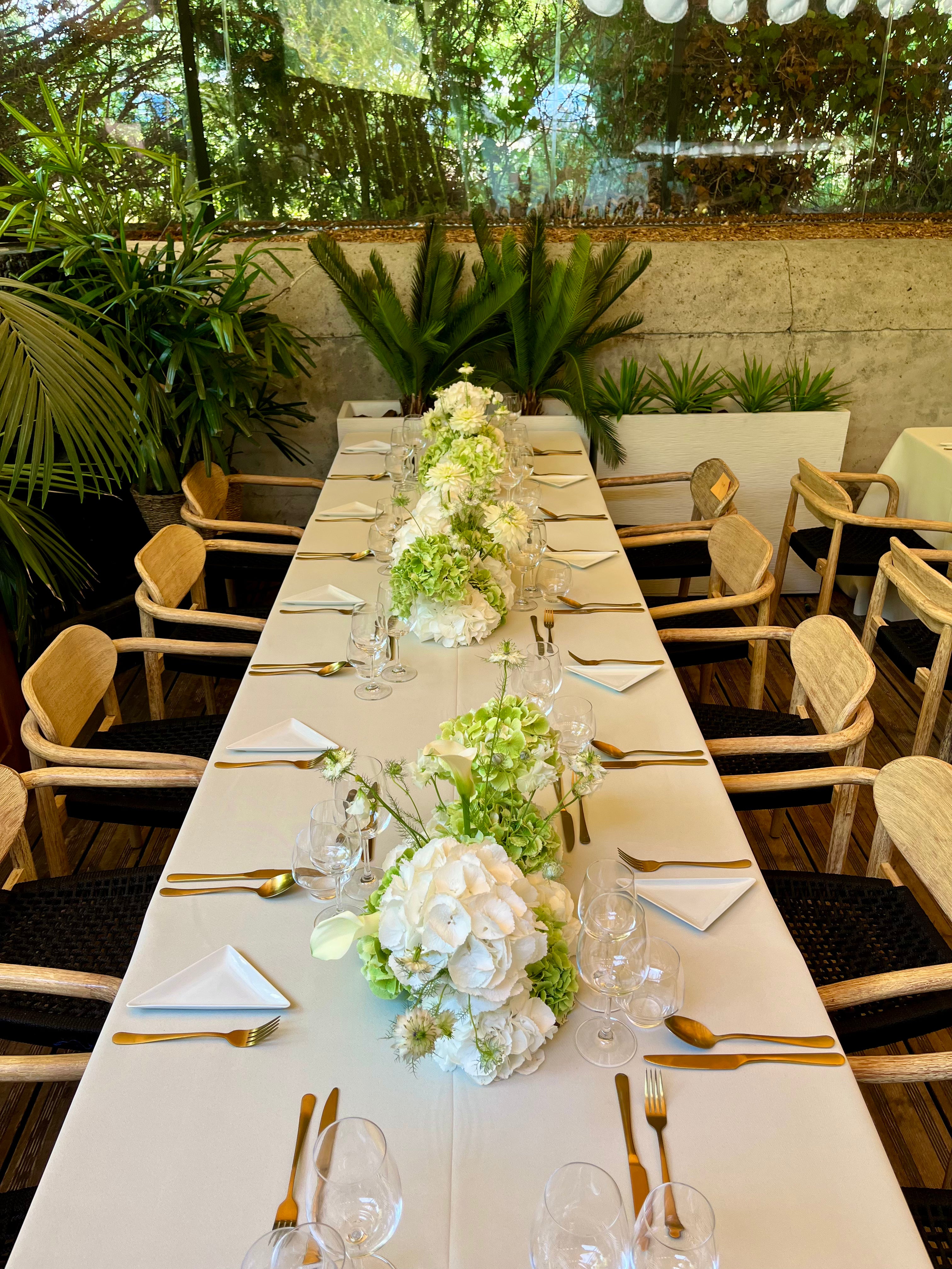 Les centres de table, véritables points d’orgue de la décoration, ont été conçus comme des compositions florales pures et contemporaines, mettant en valeur la beauté naturelle de chaque fleur.